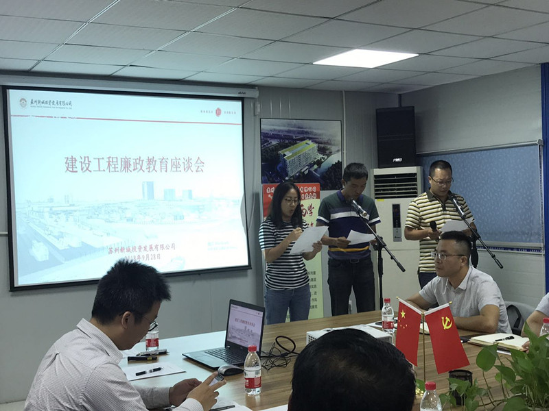 为深入贯彻党的十九大精神,切实加强公司党风廉政建设,推动全面从严治党向纵深发展,9月28日下午,苏州新城投资发展有限公司组织工程项目部、江苏白洋湾口岸建设发展有限公司子公司工程部以及相关在建工程施工方、代建方、监理方等人员,召开建设工程廉政教育座谈会。市纪委监委派驻市属企业第一纪检监察组副组长沈饬宜同志,新城投资公司党委副书记、纪律检查委员楼颖同志,党委委员、副总经理张国明同志出席会议。