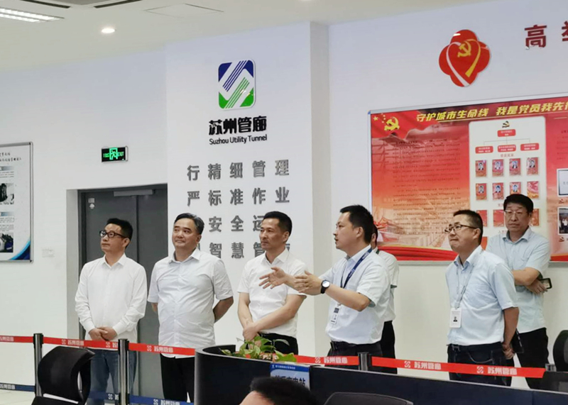 陈建斌一行首先参观了城北路地下综合管廊,城投管廊公司总经理浦春林详细介绍了苏州管廊公司的成立背景、发展过程以及苏州管廊的规划、建设、运营取得的成就。随后,陈建斌一行参观了管廊指挥监控中心监控大厅,中心工作人员展示了全苏州管廊已建和在建项目信息,并演练了应急救援预案。在座谈会上,城投项目管理公司全面介绍了公司的概况、发展及项目管理情况。陈建斌高度评价了城投公司在管廊发展、智慧平台建设、项目管理等方面取得的成绩,希望双方能够充分挖掘各自优势资源,加强交流学习,在城市开发建设、资产运营、项目管理等方面寻找合作的机会,共同发展,实现共赢。