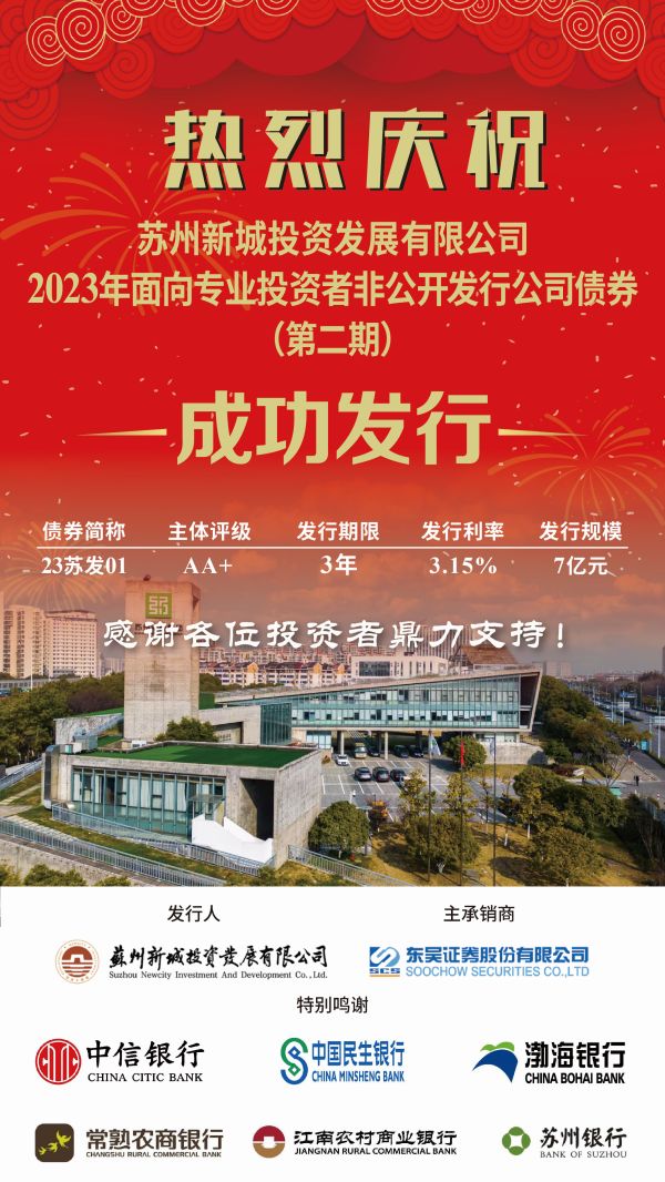 9月20日,苏州港航集团控股子公司苏州新城投资发展有限公司成功发行第二期公司债券(债券简称“23苏发02”,债券代码252547.SH),承销商为东吴证券。