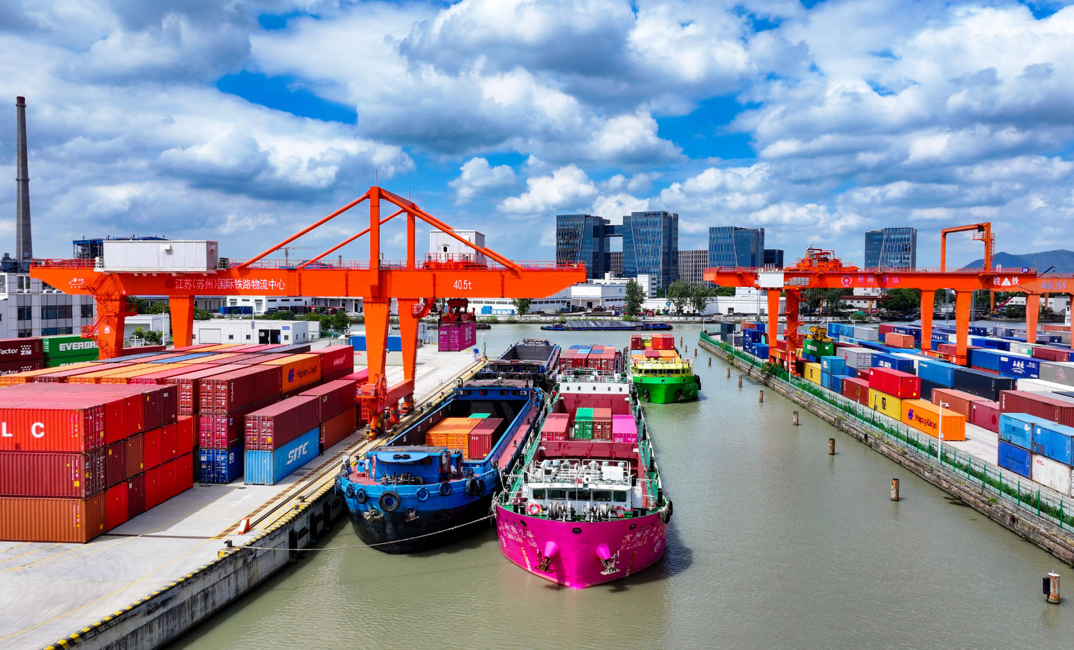 “我们以内河港口网络化、江海河联运一体化为目标,持续加强各港区间协同联动,不断丰富物流产品和服务。”港航集团相关负责人介绍。2020年8月,交通运输部批复同意利用江苏(苏州)国际铁路物流中心沿京杭运河851米岸线建设现代化集装箱智慧码头。2022年12月,中港池码头竣工并投入运营,该码头设计年吞吐量4.8万标箱、设置两个1000吨级集装箱船泊位。目前,该码头已开通至太仓港区、上海外高桥、上海洋山集装箱河海直达航线,创新开展CCA(二程船协议)航线业务,实现内河港进口集装箱水路运输本地清关,内河集装箱“双重运输”实现突破。