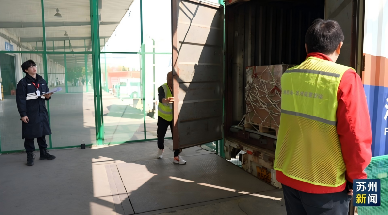 苏州港航集团苏州工业园区航港物流有限公司董事长吴雪瑾介绍,上海机场苏州前置货站是民航总局批准的全国第一个,也是目前唯一的一个,跨省市、跨关区的航空前置货站,货物在这边可以报关、称重、贴唛 ,在这边安检完了和海关查验结束以后,直接组板送上飞机,另外还建了一个专线,把所有的系统集成到一个平台上,在这个交通运输方面,它高效地达到了沪苏同城化的要求。